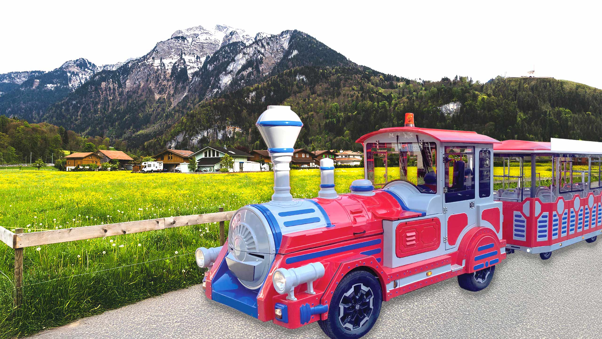 Genießen Sie eine entspannten 45-minütigen Rundfahrt durch Interlaken — an Seen, Parks und charmanten Gassen vorbei, in einem bunten Elektro-Zug.