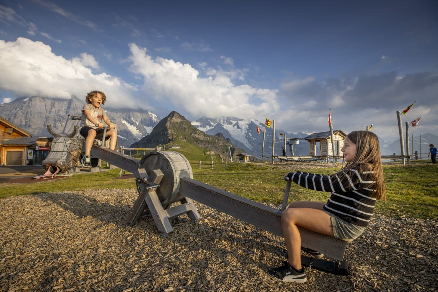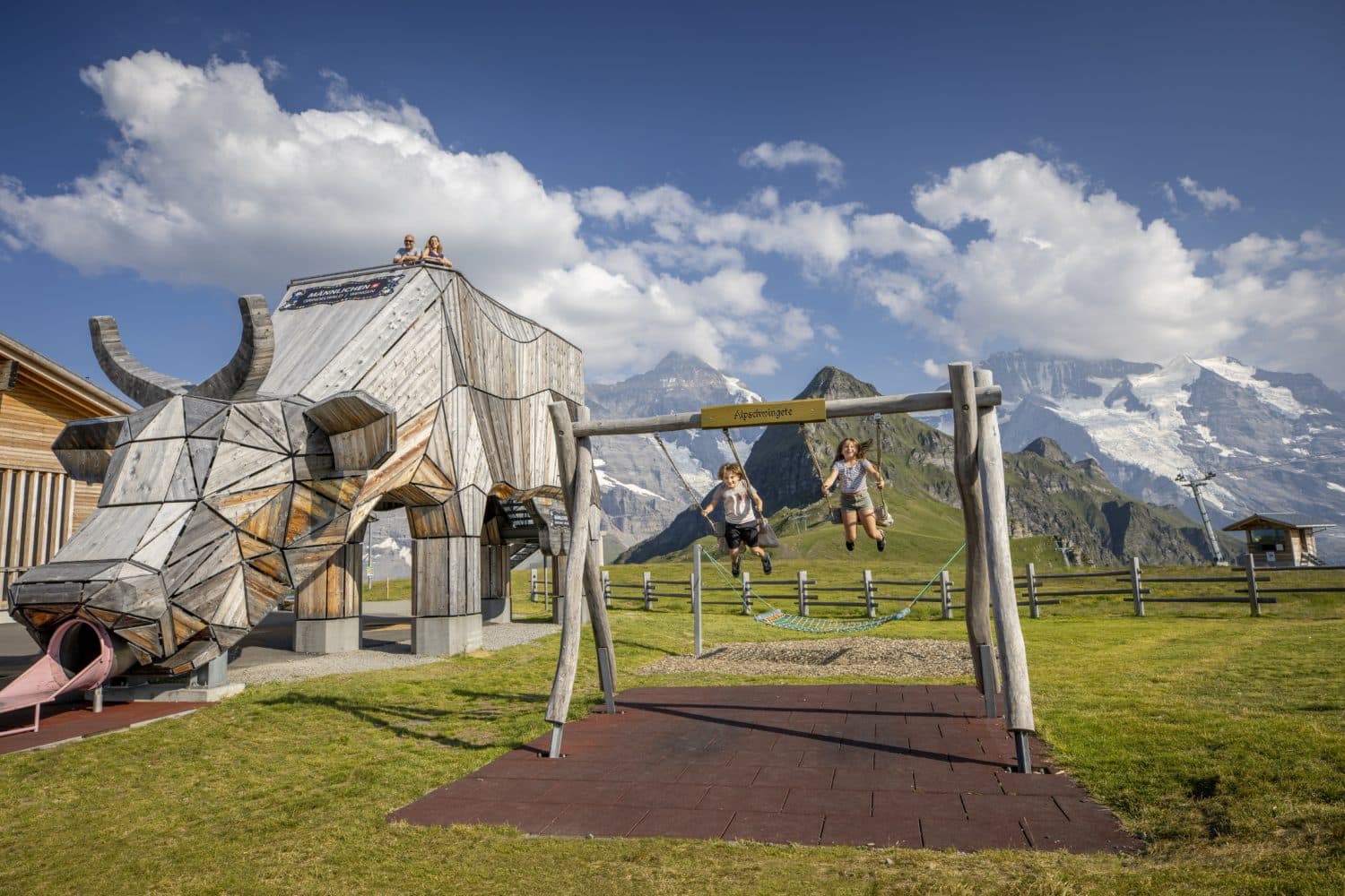 Männlichen is a fantastic destination for kids, featuring the Alpine Herdsman’s Playground with a giant walk-in cow, a viewing platform, slides, and various play equipment. Parents can relax on the terrace while keeping an eye on their children.