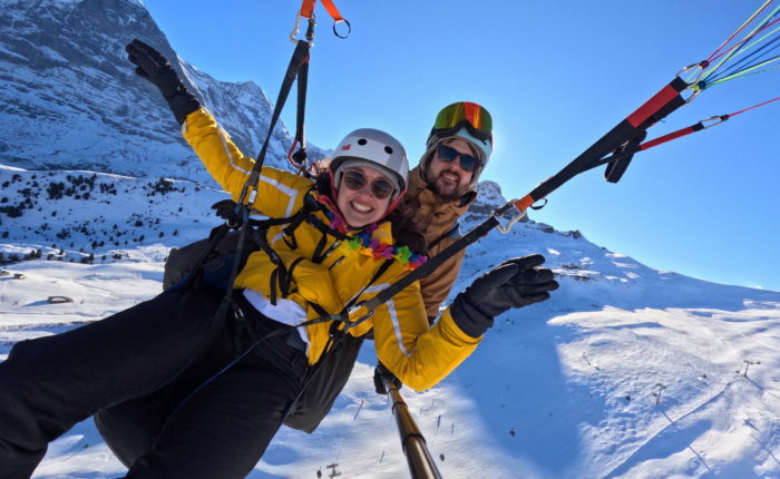 Every pilot provides his own picture and video service with a Special Paragliding Full HD Camera System to memorise your trip. Right after the flight your pilot will show you the picture and vdeo files on a tablet computer. If you want to buy these files you either get the Original SD-Card or a copy to your mobile phone. This extra service costs CHF 40.00 and has to be paid to your pilot.