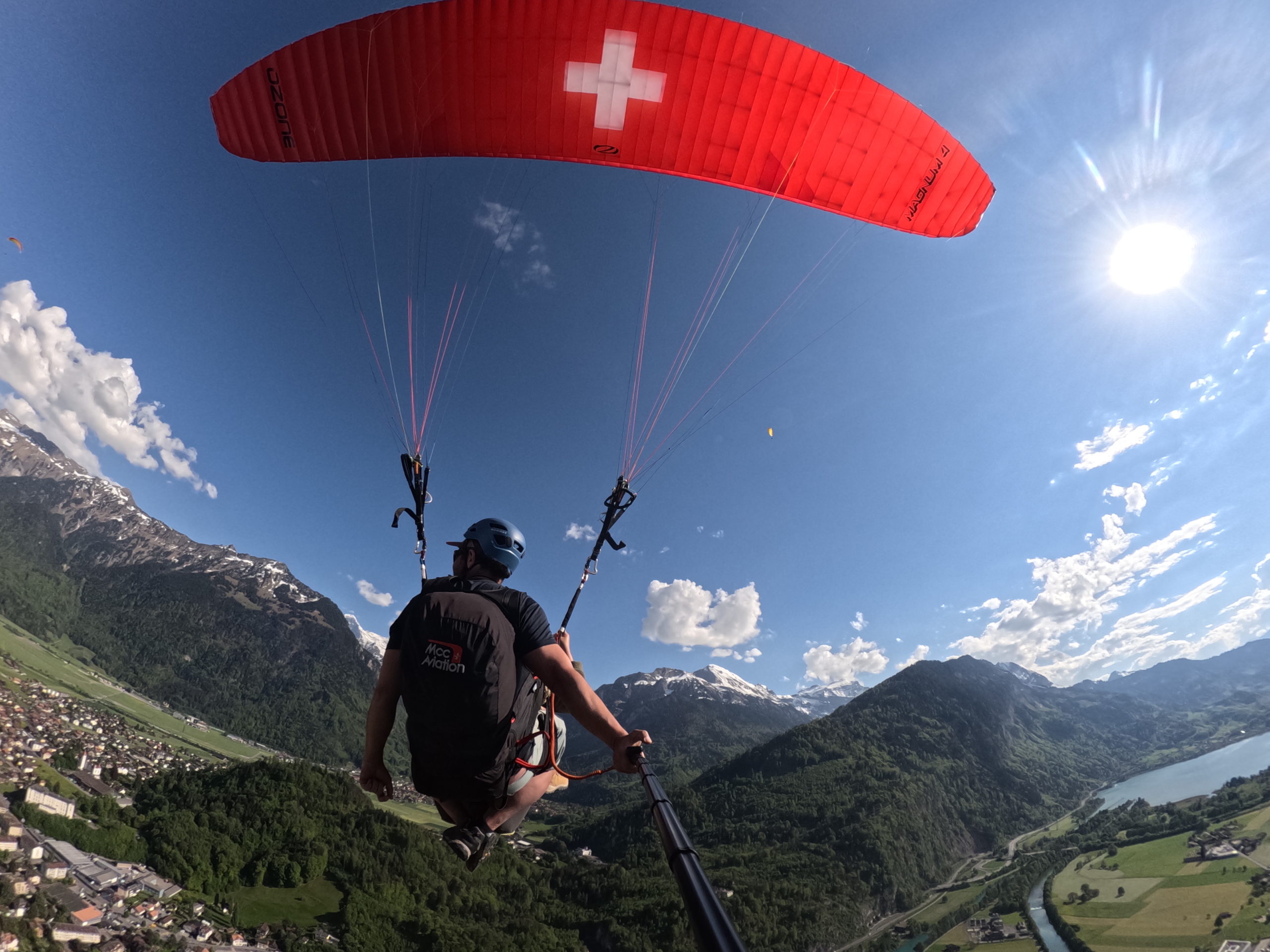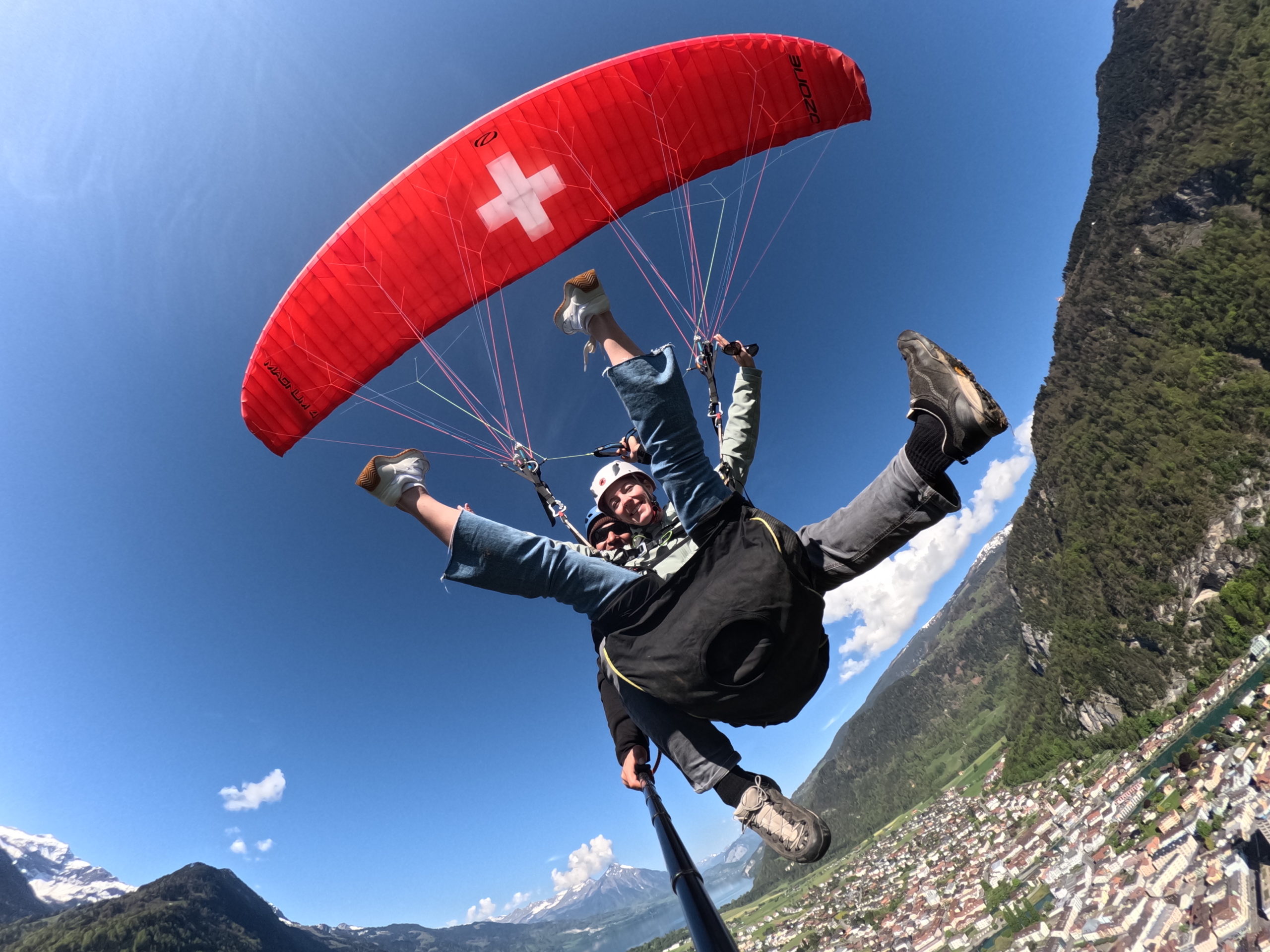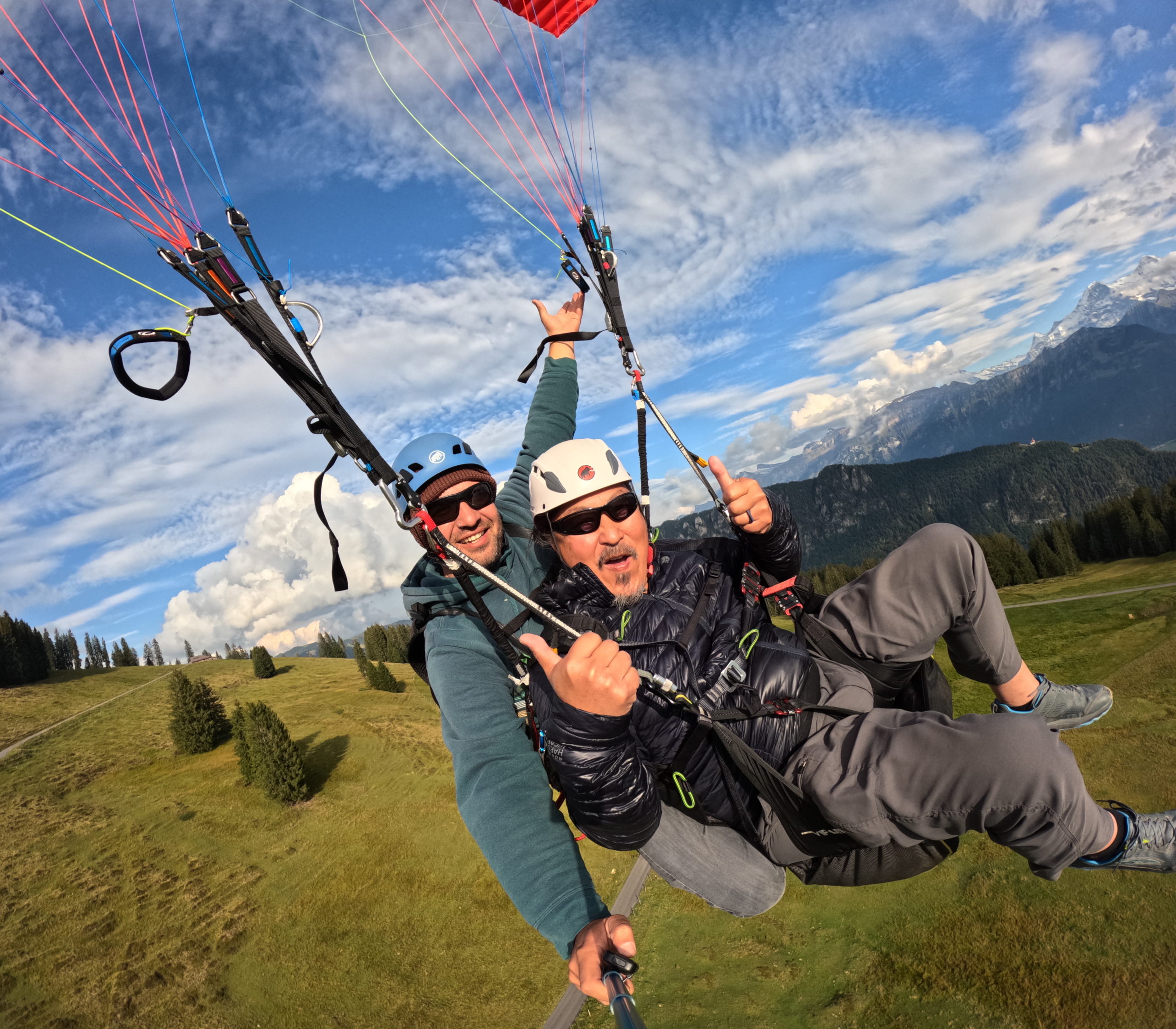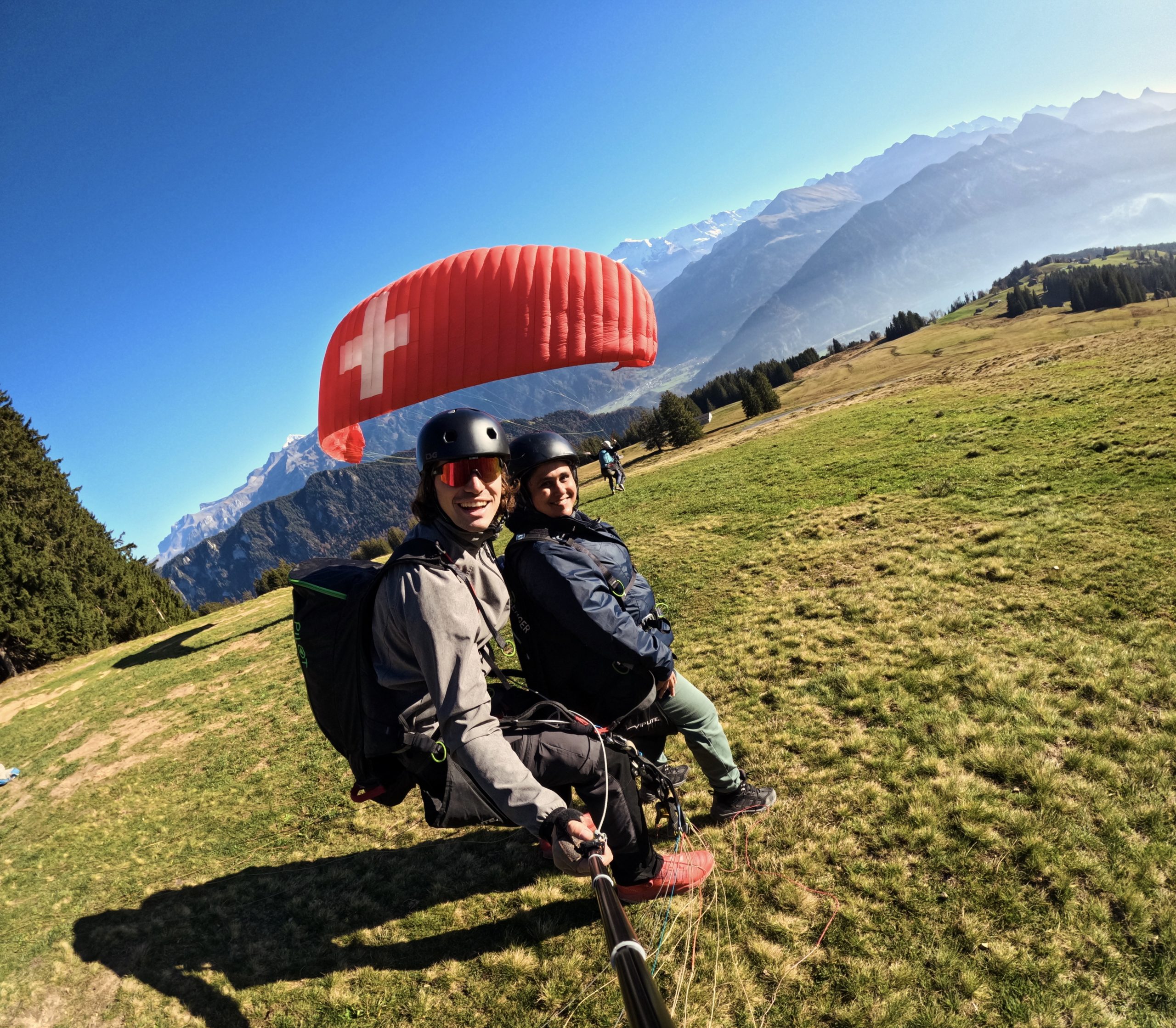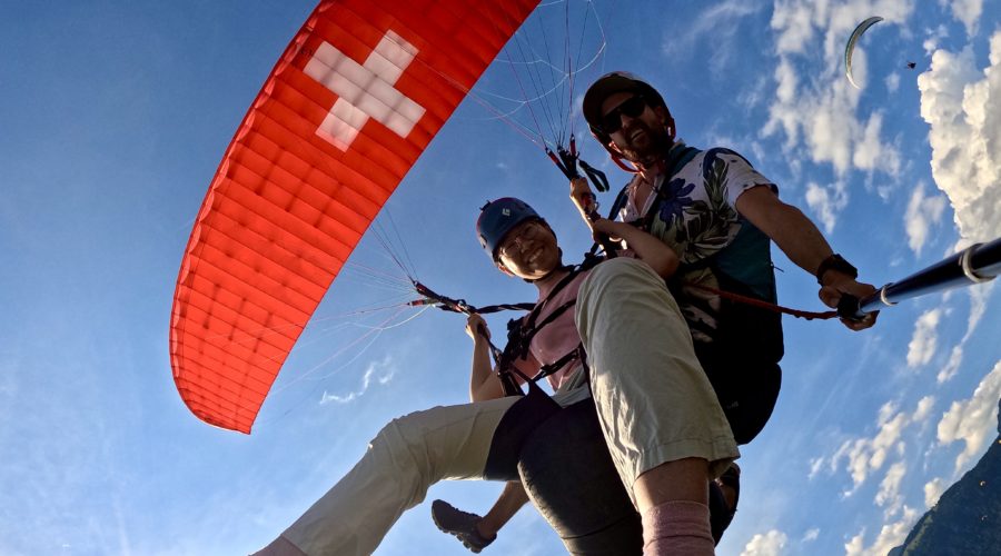 Every pilot provides his own picture and video service with a Special Paragliding Full HD Camera System to memorise your trip. Right after the flight your pilot will show you the picture and vdeo files on a tablet computer. If you want to buy these files you either get the Original SD-Card or a copy to your mobile phone. This extra service costs CHF 40.00 and has to be paid to your pilot.